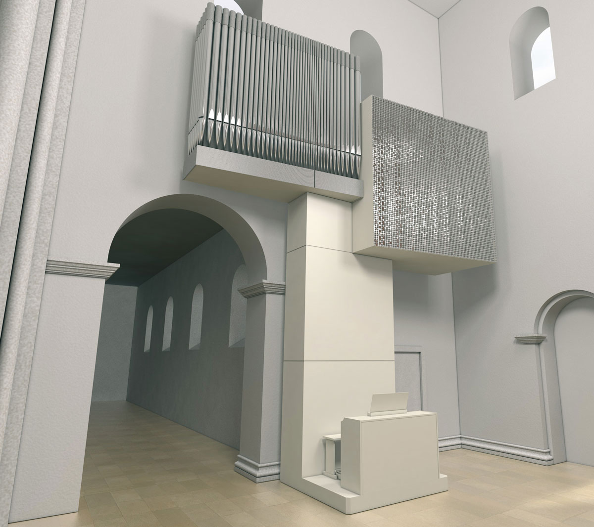 Die Orgel könnte sich leicht an eine mögliche zweite Orgel auf der Westempore der Basilika anschließen lassen, die dort dem gegenwärtigen baufälligen Instrument einstmals nachfolgen soll.